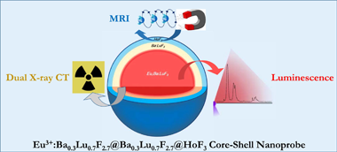 The combination of different bioimaging techniques, mainly in the field of oncology, allows circumventing the defects associated with the individual imaging modalities, thus providing a more reliable diagnosis. The development of multimodal endogenous probes that are simultaneously suitable for various imaging modalities, such as magnetic resonance imaging (MRI), X-ray computed tomography (CT) and luminescent imaging (LI) is, therefore, highly recommended. Such probes should operate in the conditions imposed by the newest imaging equipment, such as MRI operating at high magnetic fields and dual-energy CT. They should show, as well, high photoluminescence emission intensity for their use in optical imaging and present good biocompatibility. In this context, we have designed a single nanoprobe, based on a core-shell architecture, composed of a luminescent Eu3+:Ba0.3Lu0.7F2.7 core surrounded by an external HoF3 shell that confers the probe with very high magnetic transverse relaxivity at high field. An intermediate, optically inert Ba0.3Lu0.7F2.7 layer was interposed between the core and the shell to hinder Eu3+-Ho3+ cross-relaxation and avoid luminescence quenching. The presence of Ba and Lu, with different K-edges, allows for good X-ray attenuation at high and low voltages. The core-shell nanoparticles synthesized are good potential candidates as trimodal bioprobes for MRI at high field, dual-energy CT and luminescent imaging.
