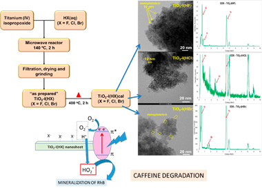 The synthesis of mesoporous TiO2 nanosheets is reported using Ti(IV) Isopropoxide as Ti(IV) precursor. A sol-gel process combined with microwave activation is used. Three different halogenhydric acids (HX), were used to peptise the sol: HF(ac), HCl (ac) and HBr (ac). The three obtained TiO2-I(HX) samples were characterized by XRD, XRF, N2-adsorption, SEM, TEM, DRS and XPS. The three synthesized samples have high values of specific surfaces (between 100 m2/g and 200 m2/g) and similar band gap values (3.2–3.3 eV). The analysis of the surface composition by XPS confirms the presence of the halogenated species (F, Cl or Br) on the surface of each ones of the samples. The nanometric size (ca 5 nm) of the particles for each of the three samples was confirmed by XRD and by TEM. On the other hand, the nature of the halogenated acid used plays a role in the composition of the phases. While the TiO2-I (HF) sample was 100 % anatase, the other samples turned out to be biphasic, showing anatase/rutile in the TiO2-I(HCl) sample and anatase/brookite in the TiO2-I(HBr) sample. The samples were tested under two illumination conditions (UV and visible light) using rhodamine B and caffeine. The indirect role of the halide agent on the photocatalytic activities thereof is discussed.