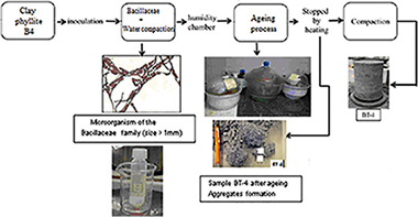 The objective of the present study is to develop a biotechnological tool for a new application of clay phyllites as stabilized materials in linear works replacing chemical stabilizer (e.g. cement or lime) by natural cement, formed by precipitated calcium carbonate generated by microorganisms of the Bacillaceae family (Bacilluspasteurii). Part of the development process conducting a chemical and mineralogical characterization and an examination of physical and hydromechanical properties. The results of this study show that the effect of bacteria on clay phyllites increases the calcium carbonate content, specific surface area and plasticity values. These increased values are caused by the addition of a non-plastic component to clay phyllites resulting in a more aggregated structure through the precipitation of calcium carbonate from the bacteria, ultimately filling the pores of this material. Microbiological treatments on clay phyllites tends to aggregate the original particles, creating aggregates that are partially associated with the formation of calcium carbonate. Said process is influenced by the curing and compaction procedures conducted on samples, which also cause breakage of carbonated structures formed during treatment. As a result of this breaking process of aggregates, some compaction energy is lost and the treated samples do not reach the maximum dry density of the natural state for the same level of compaction energy applied. Treated samples display a slightly larger friction angle with no cohesion, consistent with filling properties and denser condition. Compressibility is consistently lower than that of the natural state. Comparison of collapse data showsthat the occurrence and amount of collapse are controlled by the as-compacted dry density. It is also determined that higher compaction effort is even more effective than increasing the amount of bacteria introduced to stabilize the sample for the filling of pores (size ranges 3–50 μm) with calcium carbonate. However, the post-ageing compaction destroys the initial binding/cementation effect.