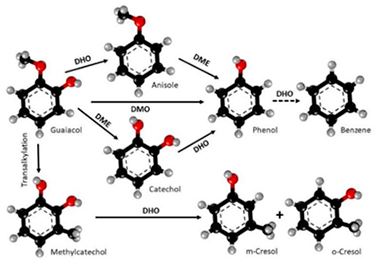 An innovative route for bio‐compounds upgrading via “hydrogen‐free” hydrodeoxygenation (HDO) is proposed and evaluated using guaiacol as a model compound in a high‐pressure batch reactor. Experimental results showed that noble metal supported on activated carbon catalysts are able to conduct tandem multiple steps including water splitting and subsequent HDO. The activity of Ru/C catalyst is superior to other studied catalysts (i. e. Au/C, Pd/C and Rh/C) in our water‐only HDO reaction system. The greater dispersion and smaller metal particle size confirmed by the TEM micrographs accounts for the better performance of Ru/C. This material also presents excellent levels of stability as demonstrated in multiple recyclability runs. Overall, the proposed novel approach confirmed the viability of oxygenated bio‐compounds upgrading in a water‐only reaction system suppressing the need of external H2 supply and can be rendered as a fundamental finding for the economical biomass valorisation to produce added value bio‐fuels.
