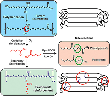 To explore the potential of long chain polyhydroxyalkanoates as non-toxic food packaging materials, the characterization of polyesters prepared from a natural occurring polyhydroxylated C16 carboxylic acid (9,10,16-trihydroxyhexadecanoic or aleuritic acid) has been addressed. Such monomer has been selected to elucidate the reactivity of primary and secondary hydroxyl groups and their contribution to the structure and properties of the polyester. Resulting polyaleuritate films have been produced using an open mold in one-step, solvent-free self-polycondensation in melt state and directly in air to evaluate the effect of oxygen in their final physical and chemical properties. These polymers are amorphous, insoluble, and thermostable, being therefore suitable for solvent, and heat resistant barrier materials. Structurally, most of primary hydroxyls are involved in ester bonds, but there is some branching arising from the partial participation of secondary O-H groups. The oxidative cleavage of the vicinal diol moiety and a subsequent secondary esterification had a noticeable effect on the amorphization and stiffening of the polyester by branching and densification of the ester bond network. A derivation of such structural modification was the surface compaction and the reduction of permeability to water molecules. The addition of Ti(OiPr)(4) as a catalyst had a moderate effect, likely because of a poor diffusion within the melt, but noticeably accelerated both the secondary esterification and the oxidative processes. Primary esterification was a high conversion bulk reaction while oxidation and secondary esterification was restricted to nearby regions of the air exposed side of cast films. The reason was a progressive hindering of oxygen diffusion as the reaction progresses and a self-regulation of the altered layer growth. Despite such a reduced extent, the oxidized layer noticeably increased the UV-vis light blockage capacity. In general, characterized physical properties suggest a high potential of these polyaleuritate polyesters as food preserving materials.