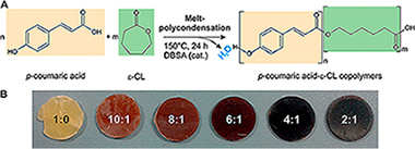 epsilon-caprolactone-p-coumaric acid copolymers at different mole ratios (epsilon-caprolactone: p-coumaric acid 1:0, 10:1, 8:1, 6:1, 4:1, and 2:1) were synthesized by melt-polycondensation and using 4-dodecylbenzene sulfonic acid as catalyst. Chemical analysis by NMR and GPC showed that copolyesters were formed with decreasing molecular weight as p-coumaric acid content was increased. Physical characteristics, such as thermal and mechanical properties, as well as water uptake and water permeability, depended on the mole fraction of p-coumaric acid. The p-coumarate repetitive units increased the antioxidant capacity of the copolymers, showing antibacterial activity against the common pathogen Escherichia coli. In addition, all the synthesized copolyesters, except the one with the highest concentration of the phenolic acid, were cytocompatible and hemocompatible, thus becoming potentially useful for skin regeneration applications.