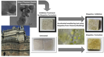 Biodeterioration of stone monuments is estimated to be as high as 20-30% of the total degradation suffered by Cultural Heritage constructions. With regard to this problem, bactericidal treatments are mainly based on cleaning. These processes, while effective in the short term, require frequent reapplications increasing potential damages to the monument. Silver nanoparticles offer many advantages over traditionally employed products, such as their prolonged biocide efficacy and their low toxicity to humans and environment. The aim of this study was to evaluate the applicability and effectiveness of seven nanocomposite treatments based on titanium dioxide and/or silver nanoparticles to prevent biodeterioration of limestone monuments. These nanocomposites were characterized by UV Visible spectrophotometry, Dynamic Light Scattering and Electron Microscopy. To assess their bactericidal activity, accelerated weathering tests were performed on limestones from the quarry of Utrera, a source widely employed in such iconic monuments as the Cathedral of Seville (Spain). Furthermore, the samples of biopatina employed in our assays stemmed from the fa ades of historical buildings from Seville. Our results show that silver and titanium dioxide nanocomposites stabilized by citrate achieve a high biocide effect while maintaining color alterations at a low level.