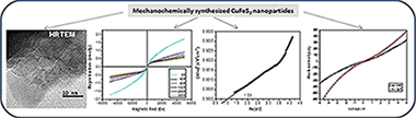 The rapid mechanochemical synthesis of nanocrystalline CuFeS2 particles prepared by high-energy milling for 60 min in a planetary mill from copper, iron and sulphur elements is reported. The CuFeS2 nanoparticles crystallize in tetragonal structure with mean crystallite size of about 38 ± 1 nm determined by XRD analysis. HRTEM study also revealed the presence of nanocrystals with the size of 5–30 nm with the tendency to form agglomerates. The Raman spectrum confirms the chalcopyrite structure. Low temperature magnetic data for CuFeS2 support the coexistence of antiferromagnetic and paramagnetic spin structure. Moreover, the hysteresis loops taken at temperatures from 5 K to 300 K revealed a presence of very small amount of ferromagnetic phase, which seems to be associated with the non-consumed elemental Fe in as-prepared nanoparticles. The optical band gap of CuFeS2nanoparticles has been detected to be 1.05 eV, larger than band gap of the bulk material. The wider gap possibly resulted from the nano-size effect. Photoresponses of CuFeS2nanoparticles were confirmed by I-V measurements under dark and light illumination. It was demonstrated that mechanochemical synthesis can be successfully employed in the one step preparation of nanocrystalline CuFeS2 with good structural, magnetic, optical and electrooptical properties.