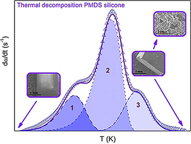In this work, we studied the thermal decomposition of a widely employed silicone elastomer, polydimethylsiloxane, in an inert atmosphere. This silicone elastomer has several applications due to its high thermal stability such as MEMS (microelectromechanical systems) precursors, microfluidic components, adhesives, lubricants, and precursors for non-porous ceramics. Therefore, a reliable description of the thermal decomposition kinetics is important to prevent or control the decomposition in such applications. While the decomposition has been amply reported as a complex process, most kinetic studies published on this system use simplified methods that avoid the fact that the entire process cannot be described by a single kinetic triplet. Here, we have studied the decomposition process by first separating the overall reaction into its three constituent steps which were subsequently analysed independently. The deconvolution was carried out using Fraser-Suzuki function that is capable of fitting an asymmetric peak fitting function. The resulting kinetic parameters proved to be able to reconstruct the original experimental curves but are also capable of producing accurate predictions of curves recorded at heating schedules different from those employed to record the experimental data used in the kinetic analysis. Finally, it was found that the rate limiting step of all stages is the diffusion of the gases released during the polymer decomposition through the transforming polymeric matrix.