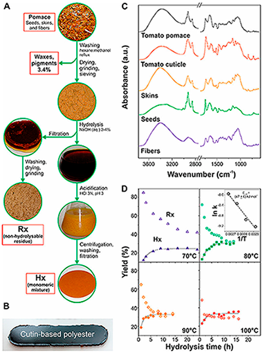 A method consisting of the alkaline hydrolysis of tomato pomace by-products has been optimized to obtain a mixture of unsaturated and polyhydroxylated fatty acids as well as a non-hydrolysable secondary residue. Reaction rates and the activation energy of the hydrolysis were calculated to reduce costs associated with chemicals and energy consumption. Lipid and non-hydrolysable fractions were chemically (infrared (IR) spectroscopy, gas chromatography/mass spectrometry (GC-MS)) and thermally (differential scanning calorimetry (DSC), thermogravimetric analysis (TGA)) characterized. In addition, the fatty acid mixture was used to produce cutin-based polyesters. Freestanding films were prepared by non-catalyzed melt-polycondensation and characterized by Attenuated Total Reflected-Fourier Transform Infrared (ATR-FTIR) spectroscopy, solid-state nuclear magnetic resonance (NMR), DSC, TGA, Water Contact Angles (WCA), and tensile tests. These bio-based polymers were hydrophobic, insoluble, infusible, and thermally stable, their physical properties being tunable by controlling the presence of unsaturated fatty acids and oxygen in the reaction. The participation of an oxidative crosslinking side reaction is proposed to be responsible for such modifications.