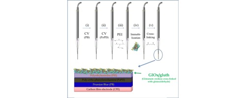 Herein we report a Prussian Blue modified carbon fiber electrode (CFE/PB) to be used in microbiosensors for glutamate monitoring in physiological applications as an alternative to the classical Pt and Pt-Ir transducers. Their low dimensions (∼250 μm CFE length and ∼10 μm diameter) are advantageous for measuring in living tissues. In addition, PB-modified microelectrodes allow the detection of enzyme-generated hydrogen peroxide at a low applied potential (∼0.0 V against SCE), contrasting the high potential used in many previous designs (∼0.7 V), decreasing the endogenous interference contributions. Moreover, the electrosynthesized polymer, poly-o-phenylenediamine (PoPD), was used to improve biosensor stability and selectivity. CFE/PB was conveniently characterized using impedance, Raman and XPS spectroscopies. Optimization of the fabrication procedure and analytical conditions is described, including activation of CFE/PB, enzyme enrichment, cross-linking, stabilization and anti-interference. A range of analytical parameters were also characterized such as sensitivity, limit of detection, linear range, and enzymatic loading. Finally, an optimized biosensor displaying a linear sensitivity of 135 ± 2 nA μM−1 cm−2 (n = 3), LOD of <2 μM, linear range up to 150 μM and effectively free of interference, is proposed as a suitable candidate for in-vivo glutamate monitoring in the central nervous system.