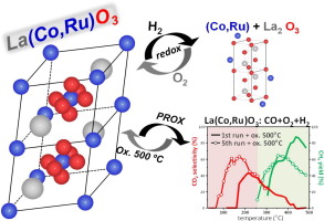 A Ru-containing perovskite-type oxide La(Co,Ru)O3 of nominal composition LaCo0.8Ru0.2O3 was prepared by ultrasonic spray combustion and tested for the preferential oxidation of CO (PROX). EXAFS indicated that Ru adopted the coordination environment of Co in LaCoO3 while Co was present as LaCoO3 and Co3O4. PROX activity was replaced by CO hydrogenation activity above 250 °C. Short oxidation at 500 °C between temperature programmed reaction ramps did not restore the initial La(Co,Ru)O3 structure but generated a catalyst with improved PROX activity compared to the initial La(Co,Ru)O3. Under reductive PROX conditions the material experienced structural changes that improved its overall catalytic activity only if the catalyst was oxidized after each temperature programmed ramp.