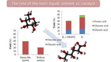 Two different approaches are proposed in this work in order to study the influence of the ionic liquid presence in the reaction of glucose oxidation by H2O2 in mild conditions. The ionic liquids are applied either as a solvent by using homogeneous Mo based catalyst, [Mo(O)(O2)2(H2O)n] complex, or by using it as an integral part of a heterogeneous catalyst, organic inorganic hybrids based on Mo Keggin structure. Both catalytic strategies resulted in acceptable glucose transformation degrees but lead to different oxidation products depending on the role of the ionic liquid. The hybrid approach restrains the number of the received products being the most selective one. A detailed study of the effect of the hybrid nature and reaction conditions is proposed in the second part of this study.