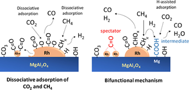 In this work, the reforming of model biogas was investigated on a Rh/MgAl2O4 catalyst. In situ transient and steady-state diffuse reflectance infrared Fourier transform spectroscopy (DRIFTS) measurements were used to gain insight into the reaction mechanism involved in the activation of CH4 and CO2. It was found that the reaction proceeds through of an initial pathway in which methane and CO2 are both dissociated on Rh metallic sites and additionally a bifunctional mechanism in which methane is activated on Rh sites and CO2 is activated on the basic sites of the support surface via a formate intermediate by H-assisted CO2 decomposition. Moreover, this plausible mechanism is able to explain why the observed apparent activation energy of CO2 is much lower than that of CH4. Our results suggest that CO2 dissociation facilitates CH4activation, because the oxygen-adsorbed species formed in the decomposition of CO2 are capable of reacting with the CHx species derived from methane decomposition.