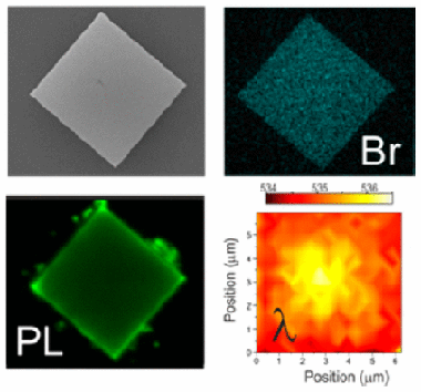 Organic lead halide perovskites have recently been proposed for applications in light-emitting devices of different sorts. More specifically, regular crystalline microstructures constitute an efficient light source and fulfill the geometrical requirements to act as resonators, giving rise to waveguiding and optical amplification. Herein we show three-dimensional laser scanning confocal tomography studies of different types of methylammonium lead bromide microstructures which have allowed us to dissect their photoemission properties with a precision of 0.036 mu m(3). This analysis shows that their spectral emission presents strong spatial variations which can be attributed to defect-related lattice distortions. It is also largely enhanced under light exposure, which triggers the migration of halide ions away from illuminated regions, eventually leading to a strongly anisotropic degradation. Our work points to the need for performing an optical quality test of individual crystallites prior to their use in optoelectronics devices and provides a means to do so.