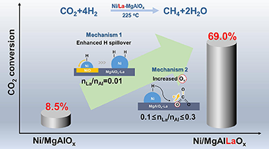 LDH-derived Ni-based catalysts are gathering momentum due to their excellent thermal stability but their lowtemperature CO2 methanation is limited. In this study, various concentrations of La were introduced into the LDH-derived Ni-based catalysts for CO2 methanation, and the underlying mechanisms were investigated. The optimal Ni/La-0.2-MgAlOx catalyst presented a CO(2)conversion level of 69.0 % at 225 C-degrees, which is over 7 times higher than that of conventional Ni/MgAlOx. The addition of small amounts of La could significantly enhance H spillover to promote the reduction of Ni species, but the oxygen vacancy concentration became the dominant factor causing changes in low -temperature activity as the La contents continue to increase. CO2 was found to be adsorbed at the oxygen vacancies in the form of bidentate carbonates, which are more reactive under an enhanced electron -rich environment. The research offers guidance to design effective and sustainable catalysts for low -temperature CO2 methanation.