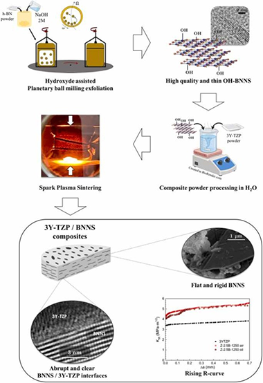 This paper deals with the effect of hydroxylated boron nitride nanosheets (BNNS) incorporation on the microstructural and mechanical features of zirconia ceramics. Few-layered BNNS were synthesized via a simple hydroxide-assisted planetary ball milling exfoliation technique. 3 mol% yttria tetragonal zirconia polycrystal (3Y-TZP) with 2.5 vol% BNNS powders were prepared by an environmentally friendly process in water, and spark-plasma sintered at three temperatures to explore the in-situ reduction of the functionalized BNNS. An exhaustive study by (S)TEM techniques was performed to elucidate the influence of the sintering temperature on the matrix and the 3Y-TZP/BNNS interfaces, revealing that BNNS were homogeneously distributed throughout the matrix with an abrupt transition at 3Y-TZP/BNNS interfaces. BNNS effectively hindered slow crack growth, thus increasing the composite's crack growth resistance by about 30 %. A 1 MPa·m1/2 rising R-curve was also induced by crack bridging.