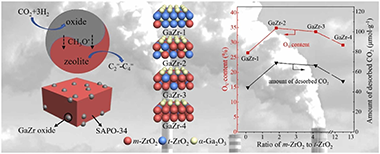A bifunctional catalyst, comprising GaZr oxide and SAPO-34 zeolite, manifests enhanced catalytic activity in CO2 hydrogenation to light olefins; nonetheless, the comprehensive analysis of the pivotal role played by the underlying structure of ZrO2 in Ga-Zr oxide has not been investigated. Herein, different crystalline structures of ZrO2 were prepared by the co-precipitation method and adopted as a support to deposit Ga to obtain ZrO2 with different ratios of monoclinic ZrO2 (m-ZrO2) to tetragonal ZrO2 (t-ZrO2) in GaZr oxides for CO2 hydrogenation to light olefins. Various characterizations demonstrated that the interface between Ga and the mixed phase of (m-t) ZrO2 produces more oxygen vacancies which favors the adsorption and activation of CO2, and the larger specific surface area and stronger H2 adsorption and dissociation capacity promote CO2 conversion. Interestingly, the GaZr oxide with high m-ZrO2 content exhibits superior catalytic activity than the GaZr oxide with high content of t-ZrO2. The highest light olefins yield (9.0%) and selectivity (77.9%) (CO free) with 27.9% CO2 conversion was achieved. In-situ DRIFT spectra further elaborated that the GaZr oxides with different ZrO2 crystalline phases follow the same reaction pathway to hydrogenate CO2 first to HCOO* and then to CH3O* on GaZr oxide surface. While compared with sole ZrO2, the introduction of Ga significantly promotes the hydrogenation of HCOO* to CH3O*, acting as a crucial reaction intermediate that subsequently diffuses into SAPO-34 pores to enhance the desired light olefins selectivity.