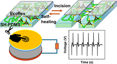 Triboelectric nanogenerators (TENGs) have emerged as potential energy sources, as they are capable of harvesting energy from low-frequency mechanical actions such as biological movements, moving parts of machines, mild wind, rain droplets, and others. However, periodic mechanical motion can have a detrimental effect on the triboelectric materials that constitute a TENG device. This study introduces a self-healable triboelectric layer consisting of an Ecoflex-coated self-healable polydimethylsiloxane (SH-PDMS) polymer that can autonomously repair mechanical injury at room temperature and regain its functionality. Different compositions of bis(3-aminopropyl)-terminated PDMS and 1,3,5-triformylbenzene were used to synthesize SH-PDMS films to determine the optimum healing time. The SH-PDMS films contain reversible imine bonds that break when the material is damaged and are subsequently restored by an autonomous healing process. However, the inherent stickiness of the SH-PDMS surface itself renders the material unsuitable for application in TENGs despite its attractive self-healing capability. We show that spin-coating a thin layer (approximate to 32 mu m) of Ecoflex on top of the SH-PDMS eliminates the stickiness issue while retaining the functionality of a triboelectric material. TENGs based on Ecoflex/SH-PDMS and nylon 6 films show excellent output and fatigue performance. Even after incisions were introduced at several locations in the Ecoflex/SH-PDMS film, the TENG spontaneously attained its original output performance after a period of 24 h of healing. This study presents a viable approach to enhancing the longevity of TENGs to harvest energy from continuous mechanical actions, paving the way for durable, self-healable mechanical energy harvesters.