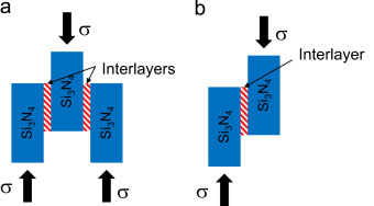 Silicon nitride/silicon nitride joints with refractory metal (W and Mo) interlayers were vacuum brazed using an active braze, Cu-ABA (Cu-3Si-2Al-2.25Ti, wt%), and two interlayer arrangements in a double-lap offset configuration: Si3N4/Cu-ABA/W/Cu-ABA/Mo/Cu-ABA/Si3N4 and Si3N4/Cu-ABA /Si3N4. Titanium segregated at the Si3N4/Cu-ABA and Mo/Cu-ABA interfaces, but not at the W/Cu-ABA interface. The room-temperature compression-shear strength values of Si3N4/Cu-ABA/Si3N4 and Si3N4/Cu-ABA/W/Cu-ABA/Mo/Cu-ABA/Si3N4 joints were 118 +/- 24 MPa and 22 +/- 5 MPa, respectively. Elevated-temperature compression tests showed that Si3N4/Cu-ABA/Si3N4 joints had strength of 31 +/- 6 MPa at 1023 K and 17 +/- 3 MPa at 1073 K. Likewise, Si3N4/Cu-ABA/W/Cu-ABA/Mo/Cu-ABA/Si3N4 joints had strength of 19 +/- 4 MPa at 1023 K and 13 +/- 3 MPa at 1073 K. Knoop microhardness profiles revealed hardness gradients across the joints. The effect of joint microstructure and test configuration on the mechanical behavior is discussed.
