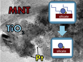 New functional TiO2-clay nanoarchitectures based on layered and fibrous silicates and incorporating Pd and Pt noble metal nanoparticles (NPs) have been synthesized by applying a sol–gel methodology that involves the use of commercial organoclays. The incorporation of the noble metal NPs can be done using two different approaches: i) direct addition to the synthesis medium of a noble metal precursor (typically acetylacetonate) during the generation of the nanoarchitecture, and ii) selective photodeposition of the noble metal NPs in a post-treatment of the TiO2-clay nanoarchitecture. The resulting materials have been characterized by means of XRD, FTIR, Raman, 29Si-NMR, FE-SEM, TEM and N2 adsorption–desorption isotherms. The efficiency of these nanoarchitectures in the photocatalytic hydrogen production has been tested in the photoreforming of methanol. The higher rate in the hydrogen production corresponds to the nanoarchitectures containing Pt and TiO2 NPs derived from sepiolite.