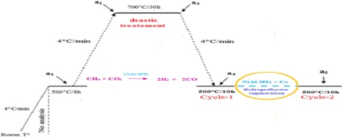 A novel approach describing the in-situ regeneration of NiAl hydroalcite derived catalyst between two cycle reaction systems of CO2 reforming of methane, also known as dry reforming of methane (DRM) is described herein. The catalyst was initially prepared by co-precipitation method at pH = 11 and calcined at 450 degrees C for 6 h. The obtained material was characterized using X-ray diffraction (XRD) spectroscopy, Fourier transform infrared (FTIR) spectroscopy, Brunauer-Emmett-Teller (BET), atomic absorption spectroscopy (AAS), scanning electron microscopy (SEM), transmission electron microscopy (TEM), thermogravimetry (TG/ATD) and temperature programmed reduction (TPR-H-2) techniques. Following treatment of our catalyst under DRM conditions, the catalyst was subjected to in-situ hydrogasification conditions to promote regeneration followed by a second DRM cycle. An increase of 15.7% in the conversion of CH4 and 17.3% in the conversion of CO2 was attained, while the ratio of resulting H-2/CO augmented by 14%. The ratio of H-2 consumed over the course of two hours hydrogasification, to that generated over ten hours of DRM, was 9.6%. The small particle sizes of resulting Ni degrees species as well as their high stability were both key factors contributing to the increase in the amount of H-2/CO produced prior to and after regeneration.