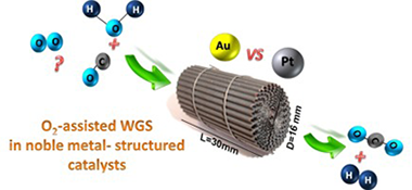 Platinum and gold structured catalysts were compared as active phases in classical and O2-assisted Water Gas Shift (WGS) reaction. Both metals were supported on iron-doped ceria mixed oxide and then, structured on metallic micromonolithic devices. As expected the WGS activity of both micromonoliths is conditioned by the nature of the noble metals being Pt the most active metal in traditional conditions. However, the addition of oxygen to the classical water gas feed turns the balance in favor of the gold based catalysts, being the presence of gold responsible for an excessive improvement of the catalytic activity.