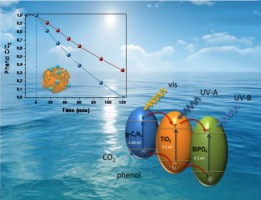 A complex ternary BiPO4/TiO2/gC(3)N(4) heterostructure has been obtained from a simple impregnation method having good photoactivities for the degradation of phenol under solar-like irradiation. From the wide structural, surface and electronic characterization, we have stated that the formation of the ternary heterojunction notably affect photoactivity of pristine TiO2. Thus, the best result for the binary system was obtained for 70 wt%TiO2-30 wt% BiPO4 system. The incorporation of gC(3)N(4) leads to a further improvement on the photocatalytic activity when it is specifically done over TiO2. By means of photoluminescence spectroscopy and reactive oxygen species formation test, we propose that the effective charge carrier separation is taking place through a cascade-driven electronic mechanism. Therefore, by choosing the adequate band-engineering tailoring an important improved photoactivity can be achieved.