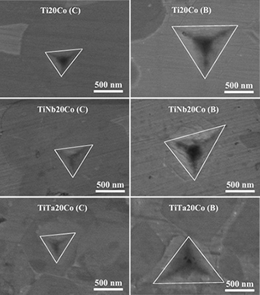 A mechanically induced self-sustaining reaction (MSR) has been successfully employed for manufacturing powdered cermets based on Ti, Ti–Ta and Ti–Nb carbonitrides using Co as the binder phase and Mo2C as the sintering additive. The powders were sintered by hot-pressing, and complete chemical, microstructural and mechanical characterizations were performed on the densified cermets. When elemental Ta, Nb and/or Mo2C were added to the initial raw mixture submitted to the MSR process, smaller ceramic grains were observed after sintering, which suggested that ceramic particle growth was hindered by the presence of Ta, Nb and/or Mo in the host titanium carbonitride structure. Nanoindentation measurements enabled the determination of the hardness of the ceramic and binder phases, and values in the range of 26–29 GPa and 14–16 GPa were found, respectively. The high hardness values of the binder were related to the formation of intermetallic phases.
