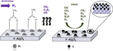 In this work, we analyze the effect of the activation method on the catalytic activity of Pt-based catalysts supported on alumina in the PROX reaction. For this, model Pt/Al2O3 catalysts with variable amounts of acetic acid were prepared and their thermal evolution studied by FTIR spectroscopy. From the analysis of the nature of the platinum surface upon acetic acid decomposition and the gas phase evolved products, we have demonstrated the formation of partially hydrogenated carbon overlayers that tailor the activity of Pt-based catalysts in the PROX reaction.