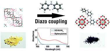 The optical absorption of UiO-66–NH2 MOF was red-shifted using a diazo-coupling reaction. The modifications performed with naphthols and aniline yielded reddish samples, and the modifications with diphenylaniline yielded dark violet ones. The photocatalytic activity of these modified MOFs was assessed for methylene blue degradation, showing a good performance relative to traditional TiO2. The degradation performance was found to correlate with the red shift of the absorption edge. These findings suggest potential applications of these materials in photocatalysis and in dye sensitized solar cells.