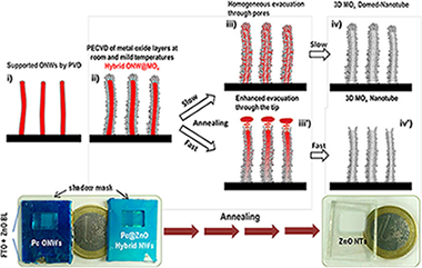 A three-step vacuum procedure for the fabrication of vertical TiO2 and ZnO nanotubes with three dimensional walls is presented. The method combines physical vapor deposition of small-molecules, plasma enhanced chemical vapor deposition of inorganic functional thin films and layers and a post-annealing process in vacuum in order to remove the organic template. As a result, an ample variety of inorganic nanotubes are made with tunable length, hole dimensions and shapes and tailored wall composition, microstructure, porosity and structure. The fabrication of multishell nanotubes combining different semiconducting oxides and metal nanoparticles is as well explored. This method provides a feasible and reproducible route for the fabrication of high density arrays of vertically alligned nanotubes on processable substrates. The emptying mechanism and microstructure of the nanotubes have been elucidated through SEM, STEM, HAADF-STEM tomography and energy dispersive X-ray spectroscopy. In this article, as a proof of concept, it is presented the straightforward integration of ZnO nanotubes as photoanode in a photovoltaic cell and as a photonic oxygen gas sensor.