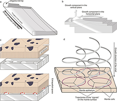 The Cavolinioidea are planktonic gastropods which construct their shells with the so-called aragonitic helical fibrous microstructure, consisting of a highly ordered arrangement of helically coiled interlocking continuous crystalline aragonite fibres. Our study reveals that, despite the high and continuous degree of interlocking between fibres, every fibre has a differentiated organic-rich thin external band, which is never invaded by neighbouring fibres. In this way, fibres avoid extinction. These intra-fibre organic-rich bands appear on the growth surface of the shell as minuscule elevations, which have to be secreted differentially by the outer mantle cells. We propose that, as the shell thickens during mineralization, fibre secretion proceeds by a mechanism of contact recognition and displacement of the tips along circular trajectories by the cells of the outer mantle surface. Given the sizes of the tips, this mechanism has to operate at the subcellular level. Accordingly, the fabrication of the helical microstructure is under strict biological control. This mechanism of fibre-by-fibre fabrication by the mantle cells is unlike that any other shell microstructure.