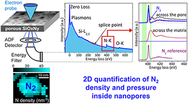 Nanoporous silicon-based materials with closed porosity filled with the sputtering gas have been recently developed by magnetron sputtering. In this work the physical properties (density and pressure) of molecular nitrogen inside closed pores in a SiOxNy coating are investigated for the first time using spatially resolved electron energy-loss spectroscopy (EELS) in a scanning transmission electron microscope. The paper offers a detailed methodology to record and process multiple EELS spectrum images (SIs) acquired at different energy ranges and with different dwell times. An adequate extraction and quantification of the N–K edge contribution due to the molecular nitrogen inside nanopores is demonstrated. Core-loss intensity and N chemical bond state were evaluated to retrieve 2D maps revealing the stable high density of molecular nitrogen (from 40 to 70 at./nm3) in nanopores of different size (20–11 nm). This work provides new insights into the quantification of molecular N2 trapped in porous nitride matrices that could also be applied to other systems.