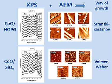 The growth of cobalt oxides by reactive thermal evaporation of metallic cobalt on highly oriented pyrolytic graphite (HOPG) and SiO2 (X cut quartz surface), in an oxygen atmosphere at room temperature, has been chemically and morphologically studied by means of X-ray photoelectron spectroscopy and atomic force microscopy. The chemical analysis, which also includes cluster calculations, reveals that for the early deposition stages on both substrates, Co2 + species are stabilized at the surface up to a coverage which depends on the substrate. Further coverages lead to the formation of the spinel oxide Co3O4. The results are discussed in terms of the dependence of the surface energy on the size of the CoO deposited moieties. On the other hand, it has been found that the initial way of growth of cobalt oxides on HOPG is of Stranski–Krastanov mode whereas on SiO2 the growth is of Volmer–Weber mode. The differences in the growth morphology have been discussed in terms of the surface diffusivity of the CoO deposits on the substrates.