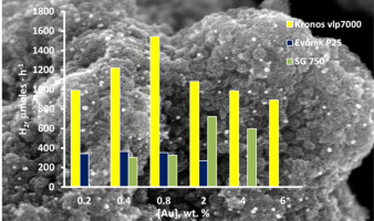 H2 production from methanol/water photo-splitting was compared using various commercial photocatalysts (Evonik P25 (P25), Hombikat UV-100 (HB) and Kronos vlp7000 (KR)) and others synthesised with a sol–gel-hydrothermal (HT) process and a sol–gel method followed by calcination (SG400 and SG750). All photocatalysts had been surface modified with Au at different concentrations, from 0.2 to 6.0 wt.%, using the photodeposition method. A complete characterisation study of the different photocatalysts was performed (BET, XRD, TEM, SEM-EDX, FTIR, UV–vis Reflectance Diffuse Spectra and aggregate size). The experiments were conducted for 3.5 h using 1 g L−1 of photocatalyst with methanol (25 vol.%) as sacrificial agent. In addition to H2 generation, production of the main intermediates, formaldehyde and formic acid, and of CO2 was also evaluated. The commercial photocatalyst KR at 0.8 wt.% Au had the highest H2 production of all the photocatalysts studied with 1542.9 μmol h−1. Of the photocatalysts synthesised by our group, SG750 at Au loading of 2.0 wt.% gave the highest H2 production of 723.1 μmol h−1. The SG750 photocatalyst at Au loading of 2.0 wt.% also had the highest H2 production yield per unit of surface area at 45.5 μmol g h−1 m−2.