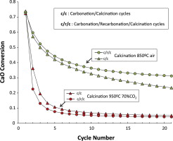 The multicyclic carbonation/calcination (c/c) of CaO solid particles at high temperature is at the basis of the recently emerged Calcium-looping (CaL) technology, which has been shown to be potentially suitable for achieving high and sustainable post-combustion CO2 capture efficiency. Despite the success of pilot plant projects at the MWth scale, a matter of concern for scaling-up the CaL technology to a commercial level (to the GWth scale) is that the CaO carbonation reactivity can be recovered only partially when the sorbent is regenerated by calcination at high temperatures (around 950 °C) as required by the CO2 high concentration in the calciner. In order to reactivate the sorbent, a novel CaL concept has been proposed wherein a recarbonator reactor operated at high temperature/high CO2 concentration leads to further carbonation of the solids before entering into the calciner for regeneration. Multicyclic thermogravimetric analysis (TGA) tests demonstrate the feasibility of recarbonation to reactivate the sorbent regenerated at high calcination temperatures yet at unrealistically low CO2 partial pressure mainly because of technical limitations concerning low heating/cooling rates. We report results from multicyclic c/c and carbonation/recarbonation/calcination (c/r/c) TGA tests at high heating/coling rates and in which the sorbent is regenerated in a dry atmosphere at high CO2 partial pressure. It is shown that at these conditions there is a drastic drop of CaO conversion to a very small residual value in just a few cycles. Moreover, the introduction of a recarbonation stage has actually an adverse effect. Arguably, CaCO3 decomposition in a CO2 rich atmosphere is ruled by CO2 dynamic adsorption/desorption in reactive CaO (1 1 1) surfaces as suggested by theoretical studies, which would preclude the growth of the regenerated CaO crystal structure along these reactive surfaces, and this effect would be intensified by recarbonation. Nevertheless, the presence of H2O in the calciner, which is also adsorbed/desorbed dynamically in CaO reactive planes, would shield CO2 adsorption/desorption thus mitigating the deeply detrimental effect of CO2 on the carbonation reactivity of the regenerated CaO structure. Oxy-combustion, which produces a significant amount of H2O, is currently used in pilot-scale plants to raise the temperature in the calciner. Auxiliary techniques are being explored to help heating the partially carbonated solids since oxyxombustion represents an important penalty to the CaL technology. Our study suggests that steam injection would be necessary in a dry calciner environment to avoid a sharp loss of CaO conversion if the sorbent is regenerated at high CO2 partial pressure.