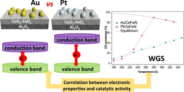 This work presents a comparison of the gold- and platinum-based catalysts behavior in the water–gas shift (WGS) reaction. The influence of the support, e.g., its composition and electronic properties, studied in detail by means of UV–Vis spectroscopy, of the metal nature and dispersion and of the stream composition has been evaluated. The catalytic performance of the samples is directly correlated with the electronic properties modification as a function of metal and/or support. Both metals present high activity in the selected reaction although in a different operation temperature window.