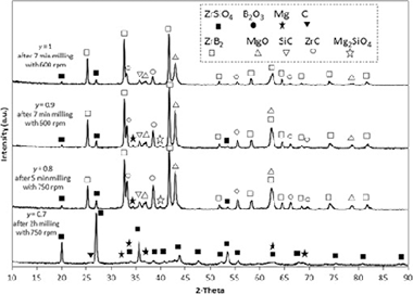 Herein, ZrSiO4/B2O3/Mg/C system was used to synthesize a ZrB2-based composite by means of a high energy ball milling process. A mechanically induced self-sustaining reaction was achieved in this system. A nanocomposite powder of ZrB2–SiC–ZrC was prepared with an ignition time of approximately 6 min of milling. The role of the stoichiometric amounts of B2O3 and carbon was investigated to clarify the governing mechanism for the formation of the product.