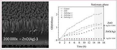 In this research work, the production of undoped and silver (Ag) doped zinc oxide (ZnO) thin films for food-packaging applications were developed. The main goal was to determine the influence of coatings morphology and thickness on the antimicrobial performance of the produced samples. The ZnO based thin films were deposited on PET (Polyethylene terephthalate) substrates by means of DC reactive magnetron sputtering. The thin films were characterized by optical spectroscopy, X-Ray Diffraction (XRD), X-ray photoelectron spectroscopy (XPS) and Scanning Electron Microscopy (SEM). The antimicrobial performance of the undoped and Ag-doped ZnO thin films was also evaluated. The results attained have shown that all the deposited zinc oxide and Ag-doped ZnO coatings present columnar morphology with V-shaped columns. The increase of ZnO coatings thickness until 200 nm increases the active surface area of the columns. The thinner samples (50 and 100 nm) present a less pronounced antibacterial activity than the thickest ones (200–600 nm). Regarding Ag-doped ZnO thin films, it was verified that increasing the silver content decreases the growth rate of Escherichia coli and decreases the amount of bacteria cells present at the end of the experiment