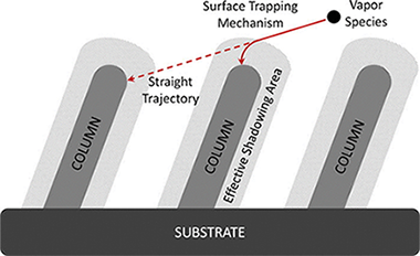 The growth of nanostructured physical vapor deposited thin films at oblique angles is becoming a hot topic for the development of a large variety of applications. Up to now, empirical relations, such as the so-called tangent rule, have been uncritically applied to account for the development of the nanostructure of these thin films even when they do not accurately reproduce most experimental results. In the present paper, the growth of thin films at oblique angles is analyzed under the premises of a recently proposed surface trapping mechanism. The authors demonstrate that this process mediates the effective shadowing area and determines the relation between the incident angle of the deposition flux and the tilt angle of the columnar thin film nanostructures. The analysis of experimental data for a large variety of materials obtained in our laboratory and taken from the literature supports the existence of a connection between the surface trapping efficiency and the metallic character of the deposited materials. The implications of these predictive conclusions for the development of new applications based on oblique angle deposited thin films are discussed.