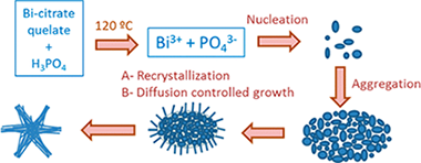 Monodisperse, monoclinic BiPO4 nanostars have been synthesized by a homogeneous precipitation reaction at 120 °C through controlled release of Bi3+ cations from a Bi–citrate chelate, in a mixture of glycerol and ethylene glycol, using H3PO4 as the phosphate source. The set of experimental conditions necessary to obtain uniform nanoparticles is very restrictive, as the change in either the polyol ratio or the reactant concentrations led to ill-defined and/or aggregated particles. The morphology of the particles consists of a starlike, hierarchical structure formed by the ordered arrangement of nanorod bundles. Transmission electron tomography has revealed that the nanostars are not spherical but flattened particles. Likewise, Fourier transform infrared spectroscopy and thermogravimetry have shown that the synthesized nanostars are functionalized with citrate groups. The mechanism of formation of the nanostars has been analyzed to explain their morphological features. The as-synthesized BiPO4 nanostars exhibit an efficient photocatalytic performance for the degradation of Rhodamine B. Finally, it has been demonstrated that the stars can be Eu3+-doped up to 2 mol % without any change in the particle morphology or symmetry, and the doped samples show emission in the orange-red region of the visible spectrum after ultraviolet excitation. These experimental observations make this material a suitable phosphor for biotechnological applications.