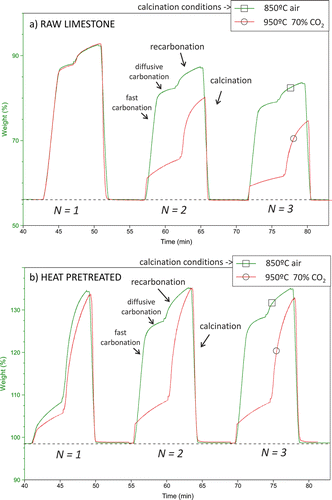 Limestone derived CaO conversion when subjected to multiple carbonation/calcination cycles is a subject of interest currently fueled by several industrial applications of the so-called Ca-looping (CaL) technology. The multicyclic CaO conversion at Ca-looping conditions exhibits two main features as demonstrated by thermogravimetric analysis (TGA). On one hand, carbonation occurs by two well differentiated phases: a first kinetically-driven fast phase and a subsequent much slower solid-state diffusion controlled phase. On the other, carbonation in the fast phase usually shows a drastic decay with the cycle number along the first carbonation/calcination cycles. This trend can be reversed by means of heat pretreatment, which induces a marked loss of fast conversion in the first carbonation but enhances diffusion of CO2 in the solid. Upon decarbonation the regenerated CaO skeleton displays an increased conversion in the fast carbonation phase of the next cycle, a phenomenon which has been referred to as reactivation. Nonetheless, sorbent reactivation is hampered by looping carbonation/calcination conditions as those to be likely found in practice such as carbonation stages characterized by low CO2 concentrations and short duration and calcination stages at high temperatures in a CO2 enriched atmosphere, which causes a sintering and loss of activity of the regenerated CaO skeleton. We analyze in this work sorbent reactivation as affected by heat pretreatment and carbonation/calcination conditions. Aimed at shedding light on the role played by these conditions on reactivation we look separately at the multicyclic evolution of conversion in the kinetic and diffusive phases. Generally, the evolution of multicyclic conversion after the first cycle can be described by a balance between the surface area gain due to diffusive carbonation and the surface area loss as caused by sintering in the calcination stage. A significant gain of relative surface area after the first cycle, which is favored by harshening the heat pretreatment conditions, leads however to a marked decay of it during subsequent cycles, which precludes reactivation for an extended interval of cycles. On the other hand, sorbent grinding, if performed before heat pretreatment, leads to a less marked but more sustainable reactivation along the cycles. A novel observation reported in our work is that pretreatment of limestone in a CO2 atmosphere leads upon a subsequent quick decarbonation to a CaO skeleton with extraordinarily enhanced reactivity in the kinetically-driven carbonation phase and with a high resistance to solid-state diffusion, which can be attributed to annealing of the crystal structure as reported by independent studies.