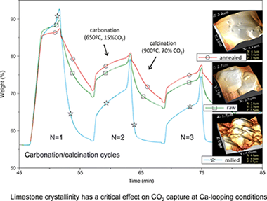 We analyze the role of limestone crystallinity on its CO2 capture performance when subjected to carbonation/calcination cycles at conditions mimicking the Ca-looping (CaL) technology for postcombustion CO2 capture. The behavior of raw and pretreated limestones (milled and thermally annealed) is investigated by means of thermogravimetric analysis (TGA) tests under realistic sorbent regeneration conditions, which necessarily involve high CO2 partial pressure in the calciner and quick heating rates. The pretreatments applied lead to contrasting effects on the solid crystal structure and, therefore, on its resistance to solid-state diffusion. Our results show that decarbonation at high CO2 partial pressure is notably promoted by decreasing solid crystallinity. CaO regeneration is fully achieved under high CO2 partial pressure at 900 °C in short residence times for the milled limestone whereas complete regeneration for raw limestone requires a minimum calcination temperature of about 950 °C. Such a reduction of the calcination temperature and the consequent mitigation of multicyclic capture capacity decay would serve to enhance the efficiency of the CaL technology. On the other hand, the results of our study suggest that the use of highly crystalline limestones would be detrimental since excessively high calcination temperatures should be required to attain full decarbonation at realistic conditions.