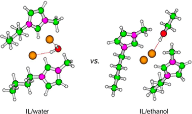 In this work, a study for understanding the role played by [ClBmim], [BF4Bmim], [PF6Bmim], and [CH3SO3Bmim] ionic liquids (ILs) in the synthesis of zeolites is presented. The use of [ClBmim] and [CH3SO3Bmim] ILs, as reported earlier [ Chem. Eur. J. 2013, 19, 2122] led to the formation of MFI or BEA type zeolites. Contrary, [BF4Bmim] and [PF6Bmim] ILs did not succeed in organizing the Si–Al network into a zeolite structure. To try to explain these results, a series of quantum mechanical calculations considering monomers ([XBmim]) and dimers ([XBmim]2) by themselves and plus cosolvent (water or ethanol) were carried out, where X ≡ Cl–, BF4–, PF6–, or CH3SO3–. Our attention was focused on the similarities and differences among the two types of cosolvents and the relation between the structure and the multiple factors defining the interactions among the ILs and the cosolvent. Although a specific pattern based on local structures explaining the different behavior of these ILs as a zeolite structuring template was not found, the calculated interaction energies involving the Cl– and CH3SO3– anions were very close and larger than those for BF4– and PF6– species. These differences in energy can be used as an argument to describe their different behavior as structure directing agents. Moreover, the topology of the cosolvent is also an ingredient to take into account for a proper understanding of the results.