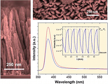 Transparent nanocolumnar porous ZnO thin films have been prepared by plasma-enhanced chemical vapor deposition. By controlling the H-2/O-2 ratio in the plasma gas, the deposition conditions were optimized to obtain an intense exciton emission at around 381 nm and virtually no luminescence in the visible region associated with electronic states in the gap. The intensity of the exciton band varied significantly and reversibly with the partial pressure of oxygen in the environment. This behavior and its variations with temperature and water vapor sustain the use of these thin films as photonic sensors of oxygen. Further experiments in liquid water show that fluorescence intensity also varies with the amount of dissolved oxygen even for concentrations lower than 0.02 mg/L where commercial oxygen galvanic sensors show limited sensitivity. These results and the use of ZnO as photonic sensor of oxygen are discussed by assuming a classical mechanism involving the photoactivated adsorption of oxygen when this oxide is irradiated with UV light during its fluorescence interrogation.
