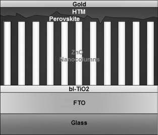ZnO thin films having a nanocolumnar microstructure are grown by plasma-enhanced chemical vapor deposition at 423 K on pre-treated fluorine-doped tin oxide (FTO) substrates. The films consist of c-axis-oriented wurtzite ZnO nanocolumns with well-defined microstructure and crystallinity. By sensitizing CH3NH3PbI3 on these photoanodes a power conversion of 4.8 % is obtained for solid-state solar cells. Poly(triarylamine) is found to be less effective when used as the hole-transport material, compared to 2,2′,7,7′-tetrakis(N,N-di-p-methoxyphenylamine)-9,9′-spirobifluorene (spiro-OMeTAD), while the higher annealing temperature of the perovskite leads to a better infiltration in the nanocolumnar structure and an enhancement of the cell efficiency.
