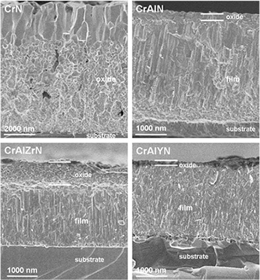 Magnetron sputtered chromium aluminium nitride films are excellent candidates for advanced machining and protection for high temperature applications. In this work CrAlN-based coatings including Y or Zr as dopants (≈ 2 at.%) are deposited by d.c. reactive magnetron sputtering on silicon substrates using metallic targets and Ar/N2 mixtures. The hardness properties are found in the range of 22–33 GPa with H/E ratios close to 0.1. The influence of the dopant element in terms of oxidation resistance after heating in air at 1000 °C is studied by means of X-ray diffraction (XRD), cross-sectional scanning electron microscopy (X-SEM) and energy dispersive X-ray analysis (EDX). The microstructure and chemical bonding are investigated using a transmission electron microscope (TEM) and electron energy-loss spectroscopy (EELS) respectively. The improvement in oxidation resistance as compared to pure CrN coating is manifested in the formation of a Al-rich outer layer that protects the underneath coating from oxygen diffusion. The best performance obtained with the CrAlYN film is investigated by in situ annealing of this sample inside the TEM in order to gain knowledge about the structural and chemical transformations induced during heating.