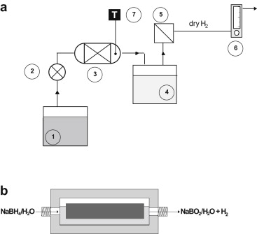 A system with a continuous reactor to produce hydrogen by sodium borohydride hydrolysis was designed and built. The purpose was to test a supported Co–B catalyst durability upon cycling and long life experiments in high conversion conditions. A Stainless Steel monolith was built and calcined to improve adherence. For comparison a Ru–B catalyst was tested upon cycling. Both Co–B and Ru–B catalysts are durable during 6 cycles and then deactivate. A known reactivation procedure has proven to be more effective for the Co–B than for the Ru–B catalyst. This is related to stronger adsorption of B–O based compounds on the Co–B catalyst which is reversible upon acid washing. For the Ru–B catalyst deactivation may be more related to particle agglomeration than to the adsorption of B–O based species. The continuous system enlarges the catalysts durability because of the continuous borate elimination at elevated temperatures.