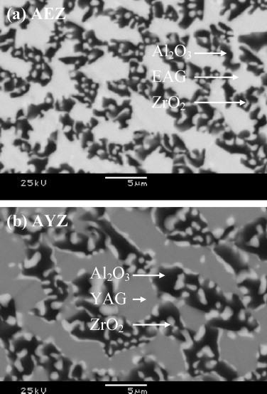 The microstructural and high-temperature mechanical characteristics of directionally solidified rods of Al2O3–Er3Al5O12–ZrO2 ternary eutectic oxides processed by the laser-heated floating zone method at different growth rates have been investigated. The eutectic microstructure displayed an entangled three-dimensional network of Al2O3 and Er3Al5O12 phases of similar sizes, elongated along the growth direction; the minority zirconia phase formed small fibers into the alumina phase. The interphase spacing is reduced with increasing solidification rate, changing about 2 μm down to 200 nm. These microstructural features are essentially the same exhibited by Al2O3–Y3Al5O12–ZrO2 composites processed by the same technique. Compressive deformation tests performed at 1400 °C at constant strain rate showed that the creep resistance decreased when increasing the growth rate due to the refinement of the microstructure.