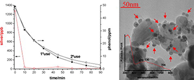 The homemade bare TiO2 photocatalyst obtained in a previous work was modified with nanosized silver particles by liquid impregnation and photodeposition methods to obtain different noble metal loadings (0.3–1 at.%). Characterization of the synthesized photocatalysts was carried out by the BET method, XPS, TEM, SEM-EDX, XRD and diffuse reflectance measurements. Photocatalytic activity of these silver-deposited TiO2 nanoparticles was tested by photocatalytic degradation of phenol as a reference model representing phenolic pollutants. The noble metal content on the TiO2 surface affected the efficiency of the photocatalytic process, and the photocatalytic activity of noble metal-modified TiO2 was considerably better than that of bare TiO2. Phenol decomposition rate was higher with TiO2 modified by the liquid impregnation method than with TiO2 modified by the photodeposition method.