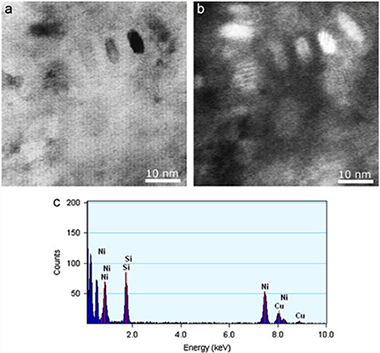 The precipitation processes in a Cu–2.8 at% Ni–1.4 at% Si alloy were studied using differential scanning calorimetry (DSC), transmission electron microscopy (TEM) and microhardeness measurements. The analysis of the calorimetric curves from room temperature to 900 K shows the presence of one exothermic reaction attributed to the formation of δ-Ni2Si particles in the copper matrix that was confirmed by Transmission Electron Microscopy (TEM) and EDS microanalysis. The activation energies calculated for the precipitation of δ-Ni2Si was lower than the ones corresponding to diffusion of nickel and silicon in copper. A correlation between of microhardness of the alloy and the formation of δ-Ni2Si particles has been found.