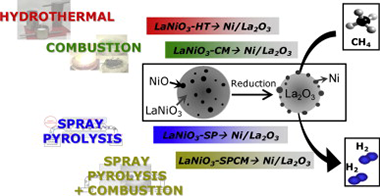 The objective of the present work has been the study of the physico-chemical and catalytic properties of Ni/La2O3 catalysts obtained by reduction of four LaNiO3 samples prepared by different methods. The LaNiO3 precursors as well as the resulting Ni/La2O3 catalysts, were characterized by scanning electron microscopy (SEM), X-ray diffraction (XRD), X-ray absorption spectroscopy (XAS), temperature programmed reduction and oxidation (TPR, TPO). The catalytic performances of these systems for dry reforming of methane (DRM) were also tested. These samples show different physico-chemical properties resulting from the synthesis method used. The XAS and TPR measurements show that in all four LaNiO3 samples there is, in addition of the crystalline LaNiO3 rhombohedrical phase, a significant amount of an amorphous NiO phase, not detectable by XRD but evidenced by XAS. The amount of this NiO amorphous phase seems to play, together with some other microstructural parameters, an important role in the performance of the Ni/La2O3 samples for the DRM reaction.