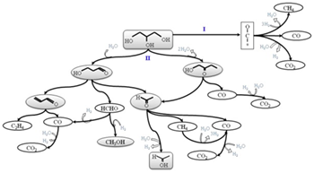 The production of hydrogen by glycerol steam reforming was studied using CeZr(Co, CoRh) catalysts. The effect of Co and Rh presence on the properties of the mixed oxides and the effect on the catalytic behavior were considered. The catalysts were characterized before and after testing by XRD, Raman, TPR, H 2-TPD, TPD-TPO and HRTEM. It was observed that the presence of Co allowed the selective H 2 production related with the presence of a metallic phase at the beginning of the reaction. The presence of Rh favored even more the H 2 production and also increased the stability of the catalyst. For CeZrCoRh, the presence of both metals enhanced the catalyst reduction capacity, a characteristic that significantly improved the catalytic behavior for glycerol steam reforming. The selective H 2 production was related to the capacity of the catalyst to activate H 2O under the reaction conditions. The progressive loss of this capacity decreases the production of H 2, and glycerol decomposition is actually favored over glycerol steam reforming. According to the initial distribution of products, and its evolution with time on stream, two main reaction pathways were proposed.